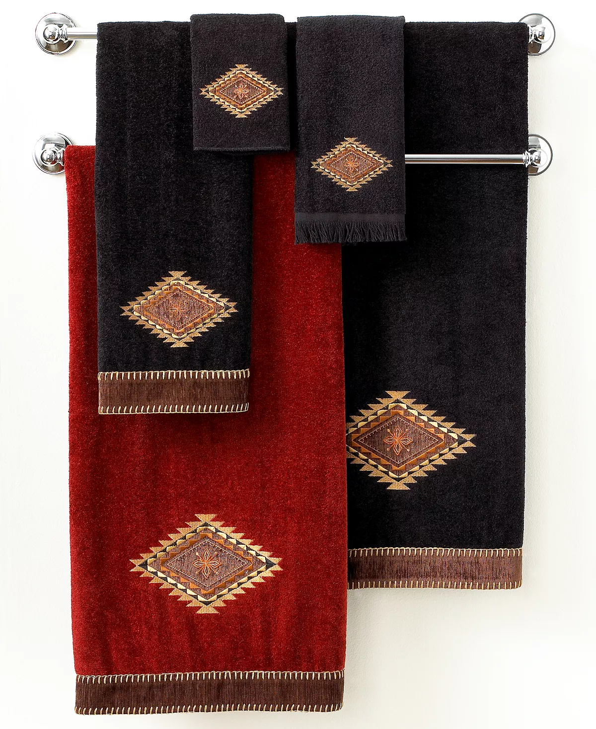 Style your bath with the spirit of the Southwest. Featuring an embroidered Aztec medallion appliqué accented with a chenille whip-stitched fabric band, the Mojave hand towel invigorates your bath with rich color and stunning details.