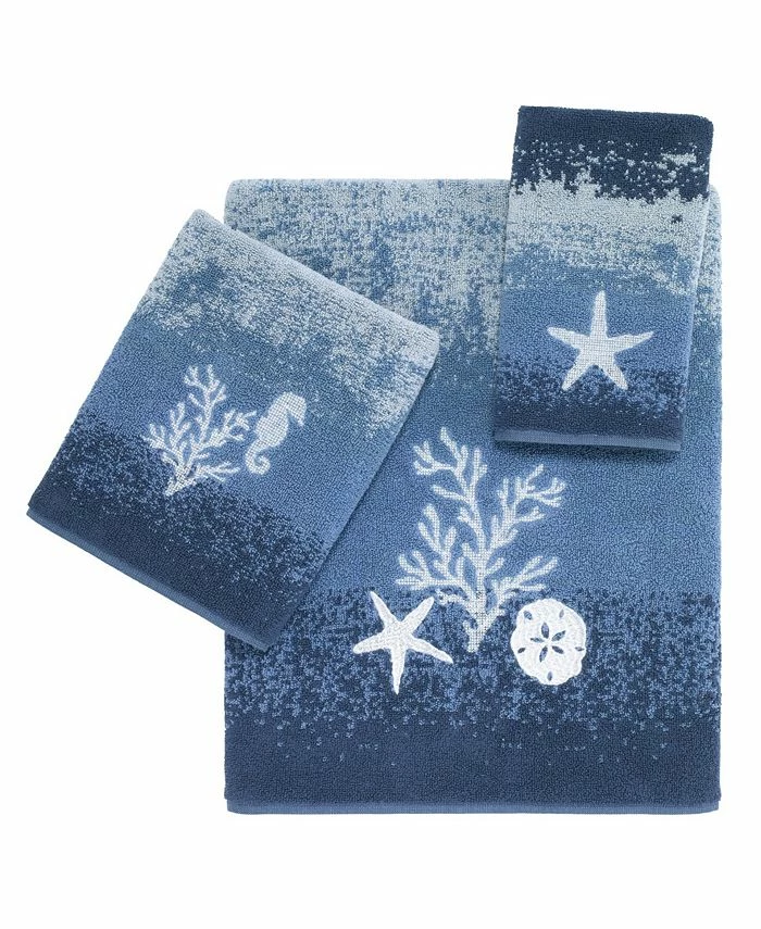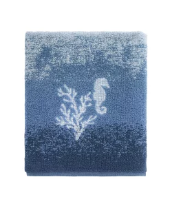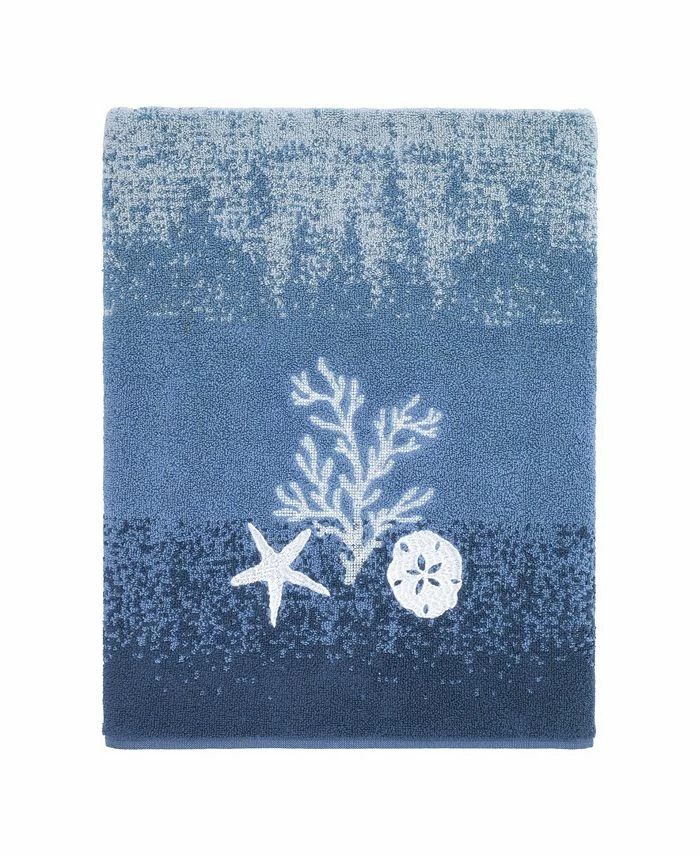 The Avanti Batik Coastal Bath Towel is decorated with embroidered ocean icons-coral, starfish, sand dollar-on an Ombre navy blue-to-white jacquard ground. Coordinates with matching shower curtain, shower curtain hooks and bath rug.