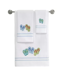 The Avanti beach mode bath towel is decorated with 3 pairs of colorful embroidered flip-flops in various shades of blue and green on a white ground. Made of soft, absorbent fabric with light blue border. Coordinating pieces available.