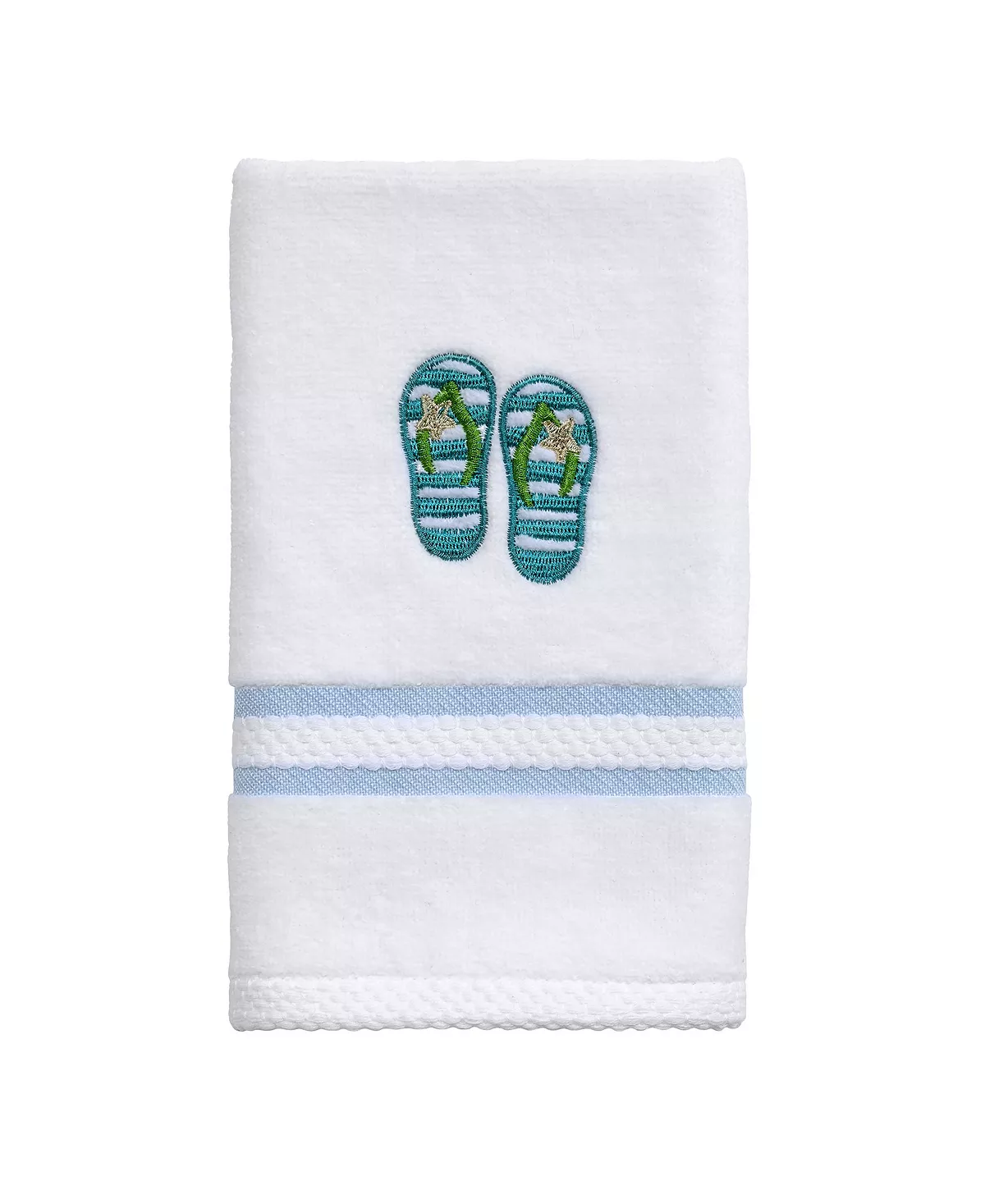 The Avanti beach mode fingertip towel is decorated with a pair of embroidered flip-flops in blue and green on white ground. Made of soft, absorbent fabric ring spun terry with light blue border. Coordinates with matching shower curtain, accessories and bath rug.