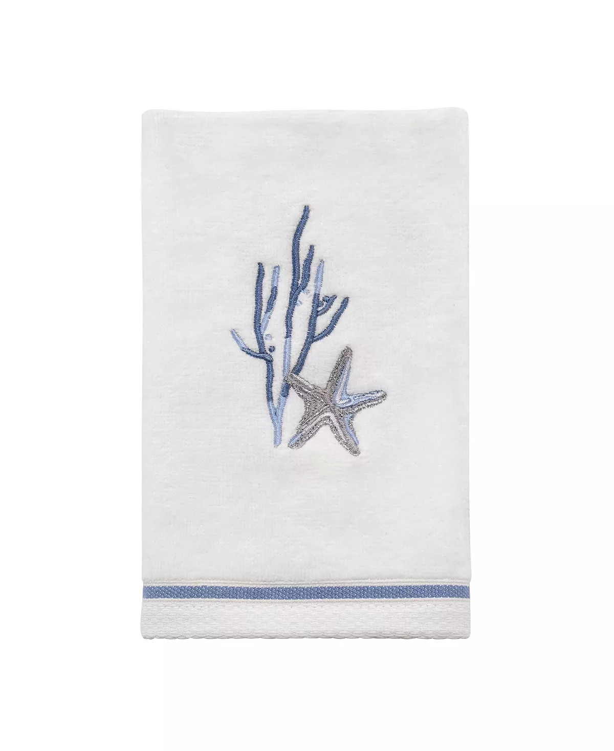 The Avanti abstract coastal decorative fingertip towel features an embroidered starfish in shades of blue and beige. Decorative end hem finishes the look.
