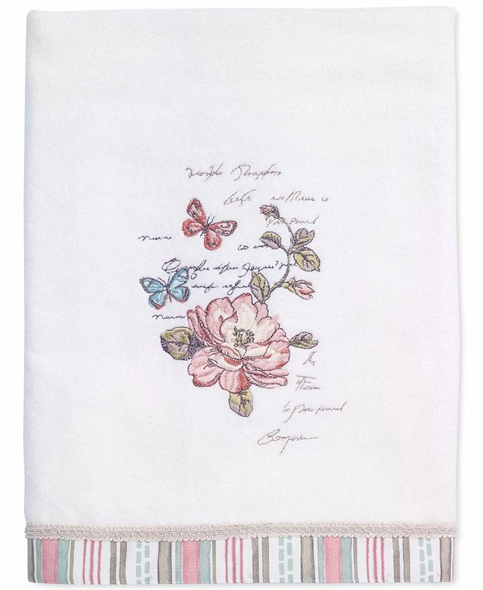 Elevate your bath with the lovely and inviting Butterfly Garden Cotton bath towel from Avanti. This soft cotton velour piece has delicate floral embroidery accented by flitting butterflies, handwritten details, and a watercolor stripe border that adds a modern touch.