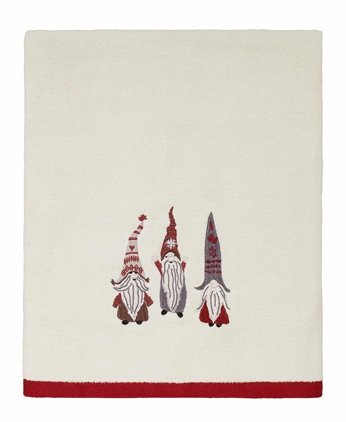 The Avanti Christmas Gnomes Bath Towel features 3 embroidered festively dressed gnomes on a exclusive of embellishment and border ivory velour towel. Towel is finished with a coordinating red polyester border.