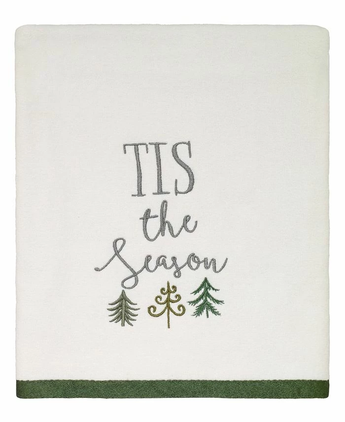 The Avanti Christmas Trees Bath Towel features “Tis the Season” and a series of whimsical Christmas trees embroidered on a exclusive of embellishment and border white velour towel.