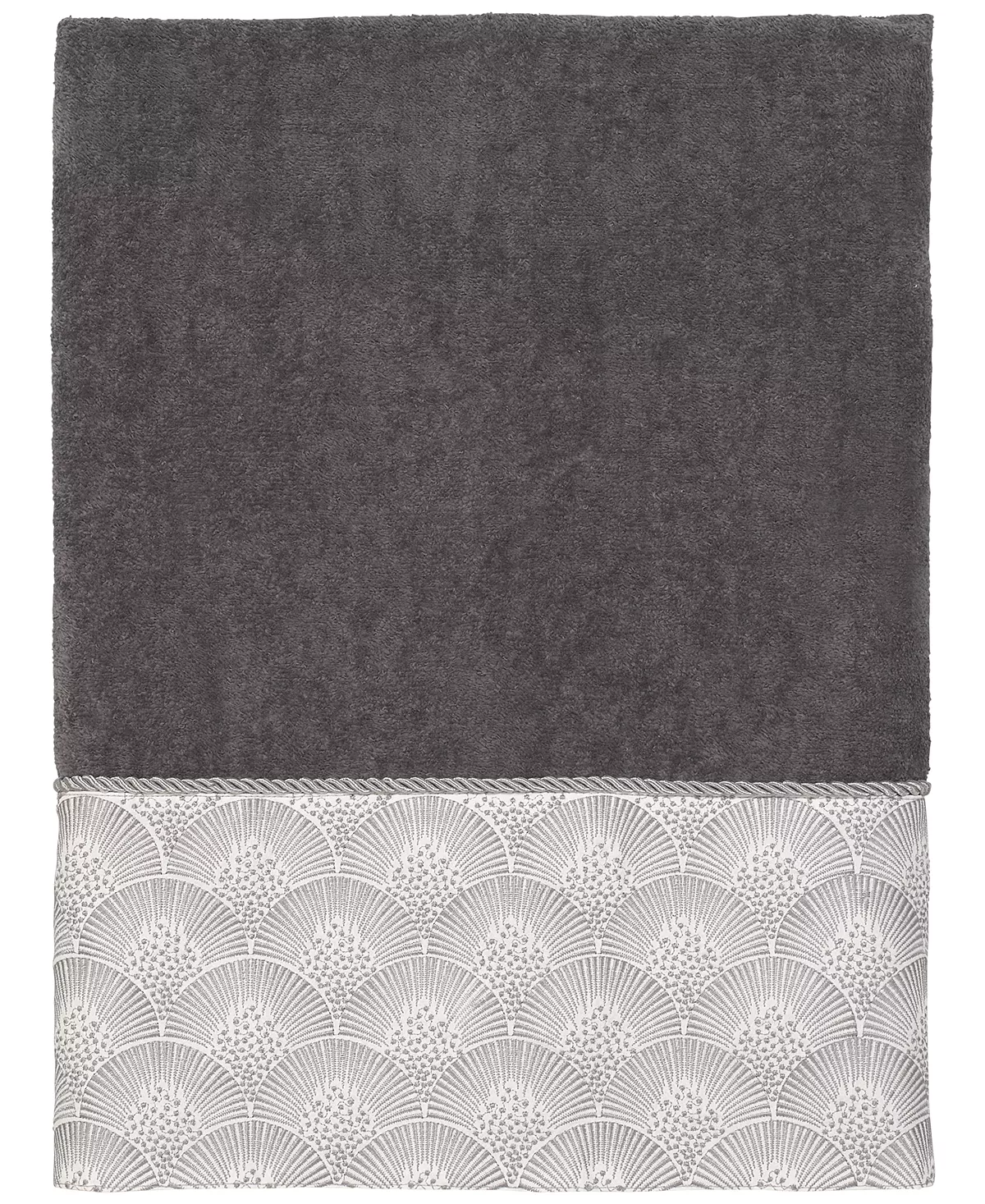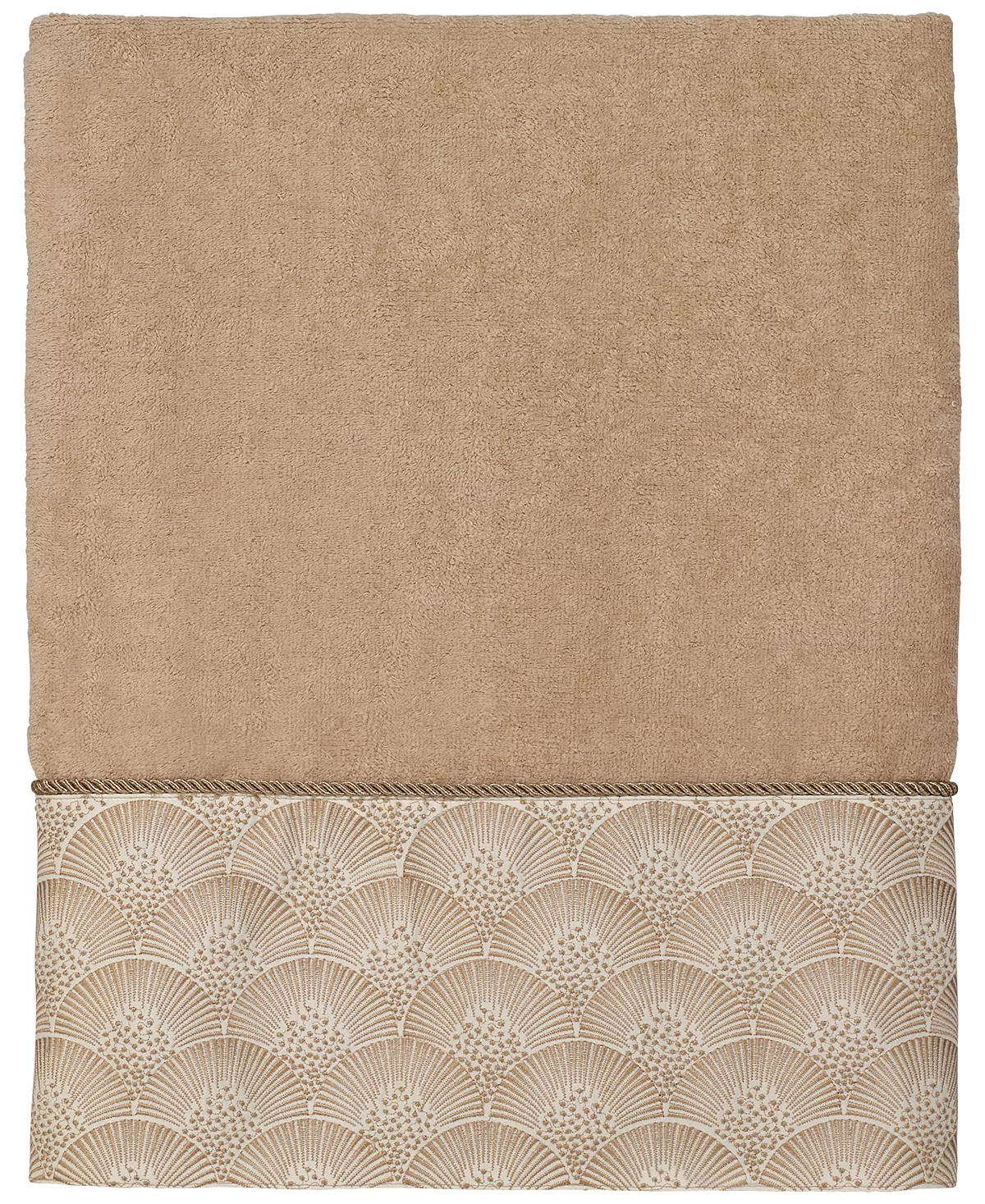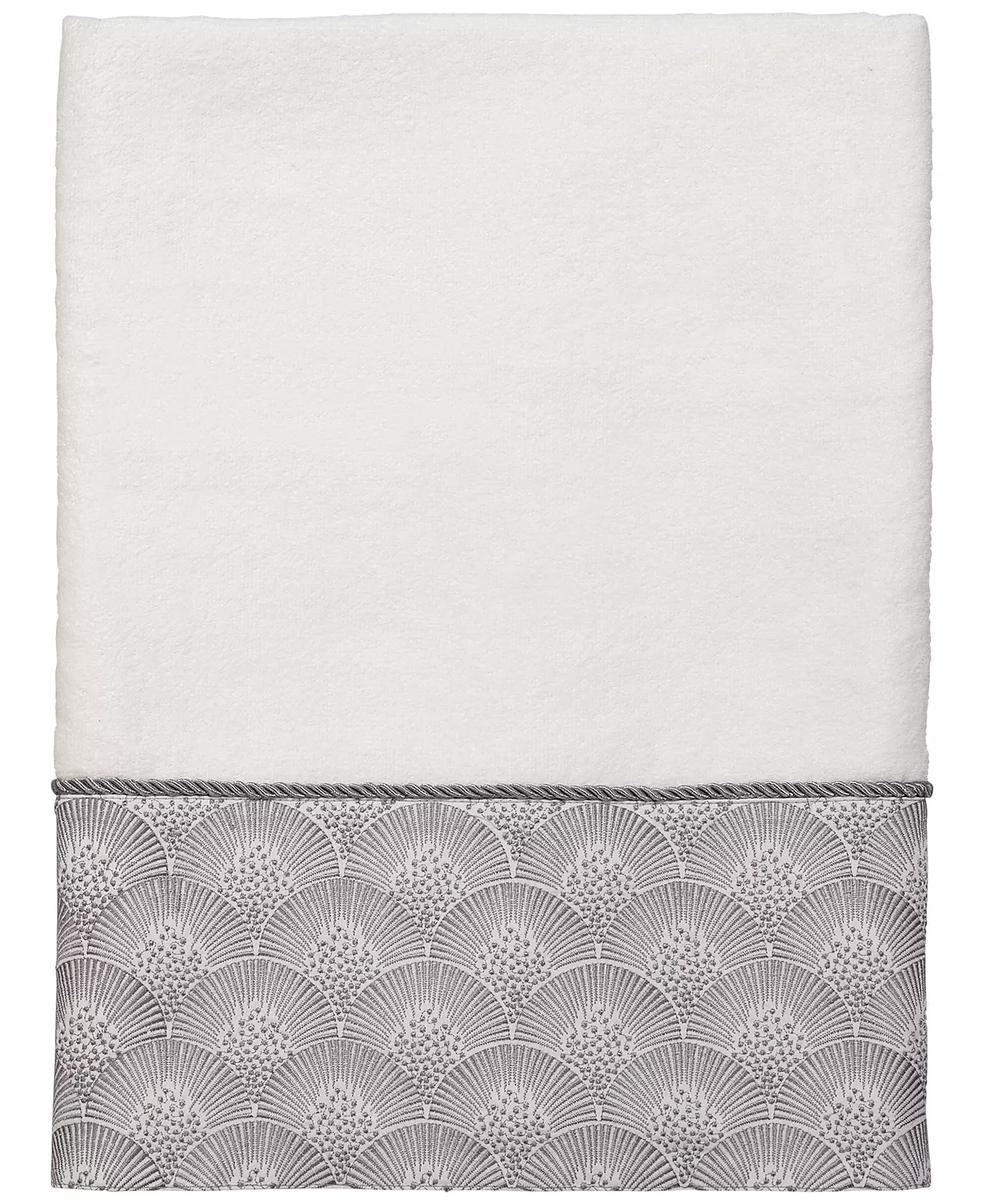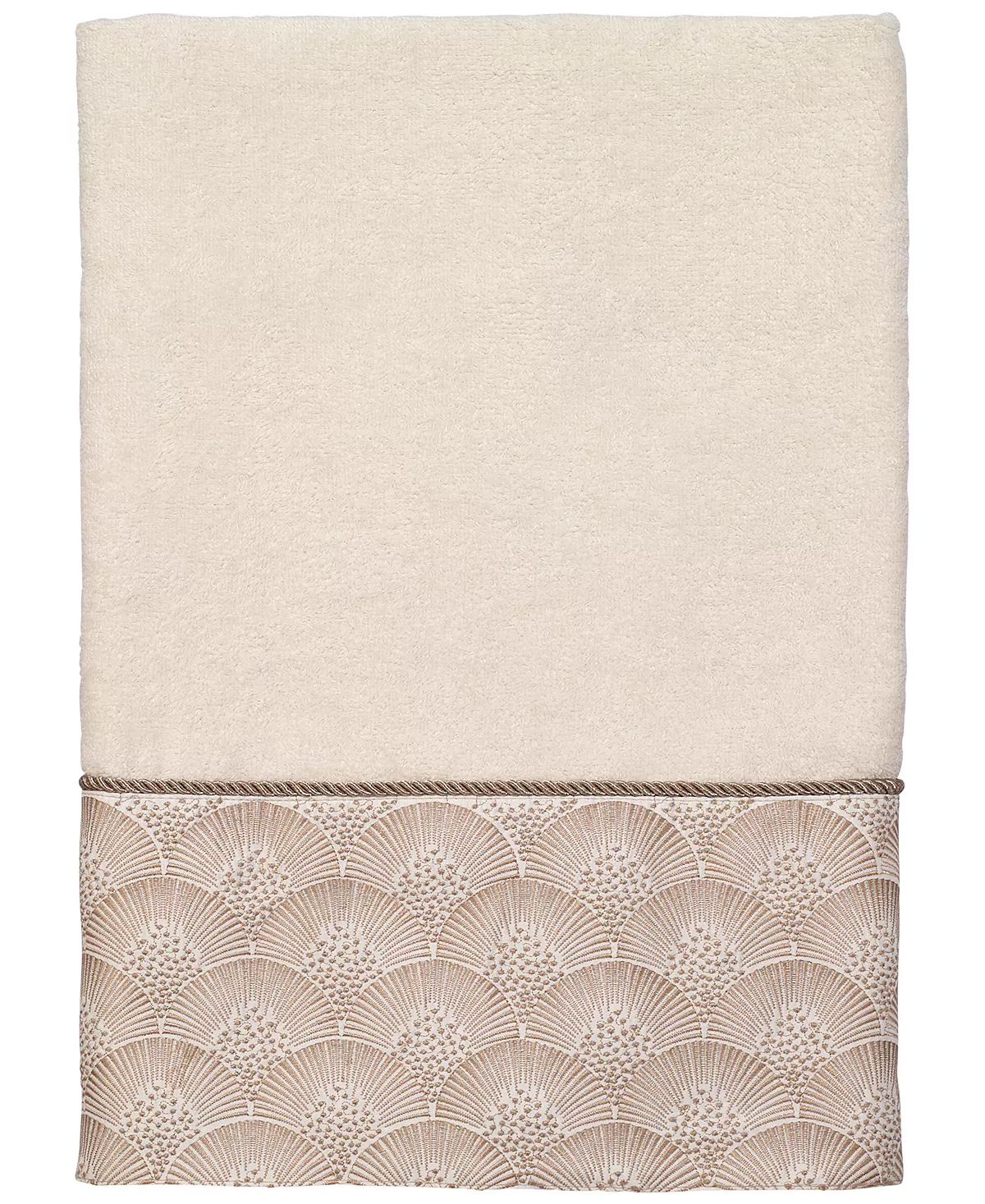 The Avanti Deco Shells Bath Towel features an embroidered band of coordinating shells on a tonal fabric attached to a 100% cotton velour towel. The band is finished with a coordinating rope trim.