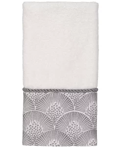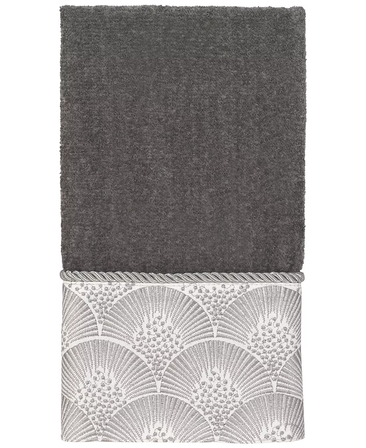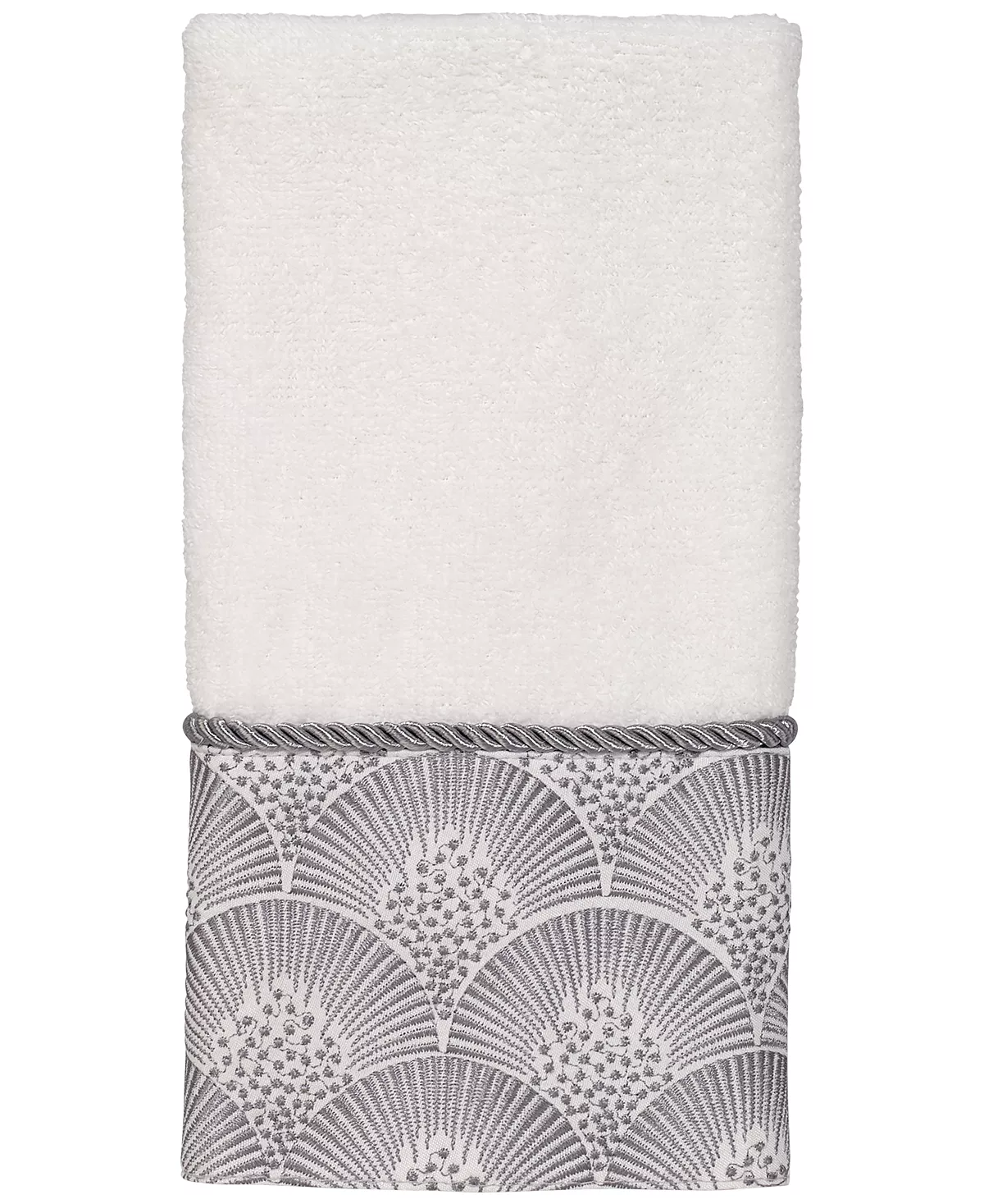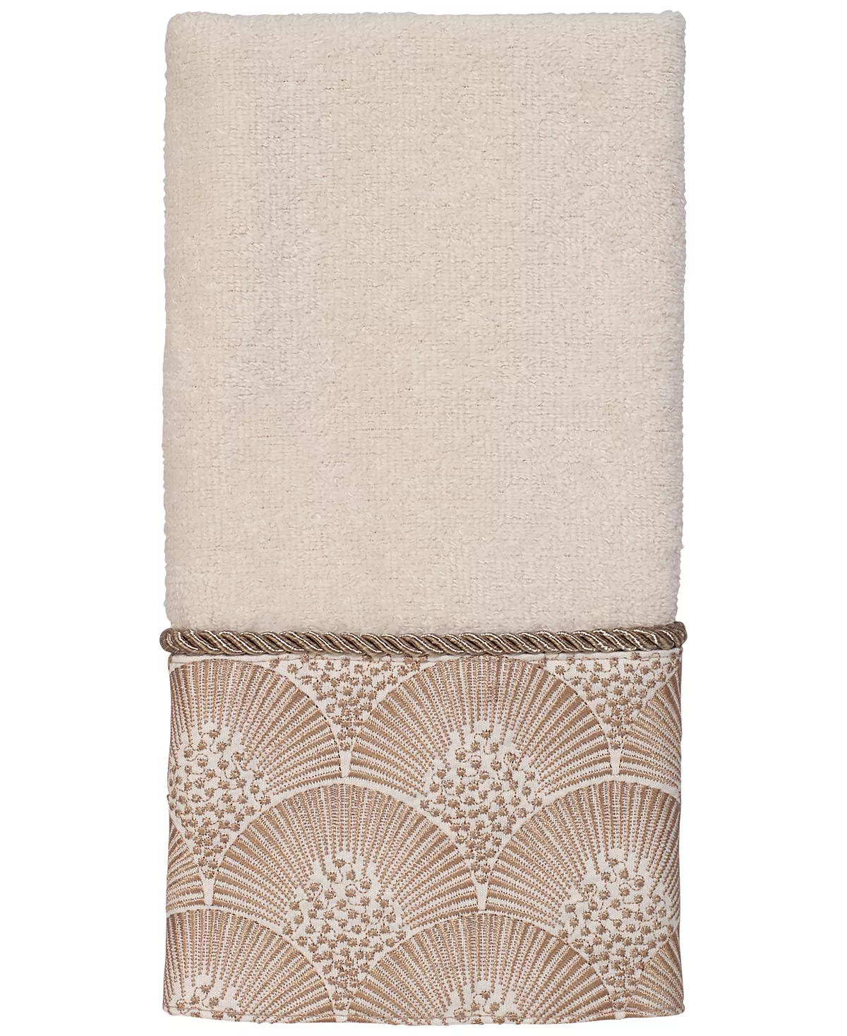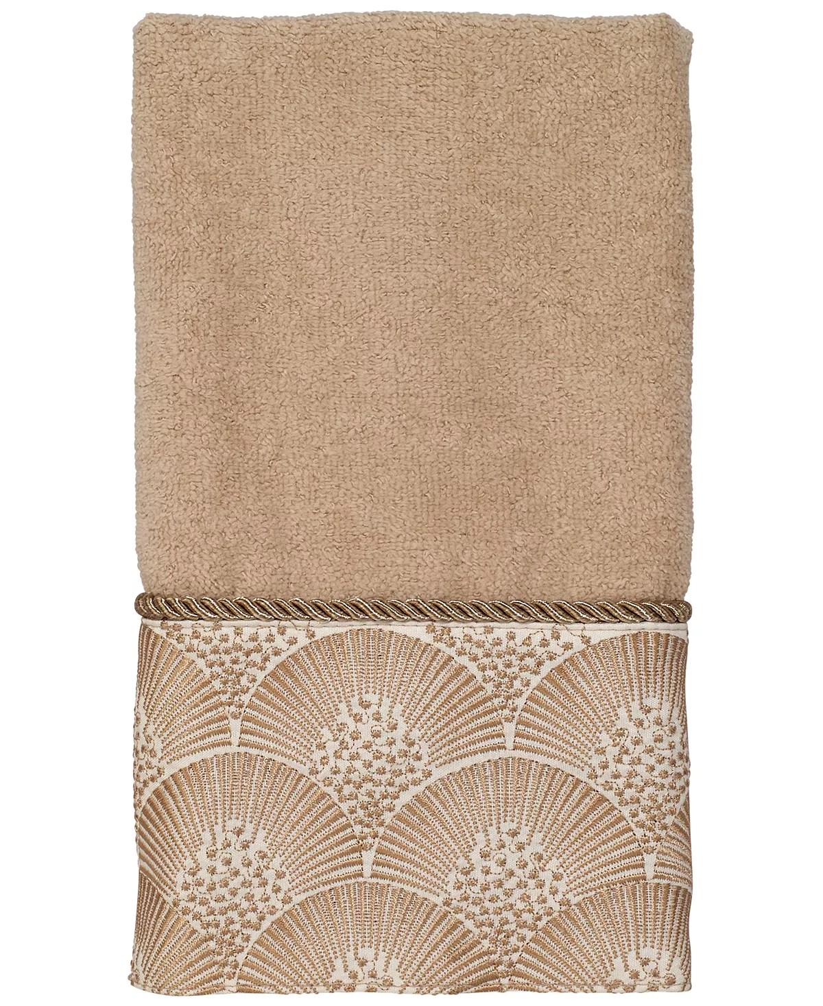 The Avanti Deco Shells Fingertip Towel features an embroidered band of coordinating shells on a tonal fabric attached to a 100% cotton velour towel. The band is finished with a coordinating rope trim.