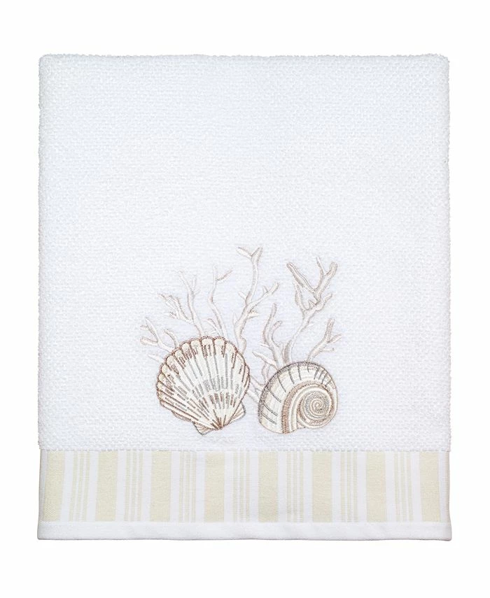 The Avanti Destin Bath Towel features a beautifully embroidered shell and coral design in grey and beige tones on a 100% cotton terry towel. The towel is finished with a beige and white vertical striped border. Imported.