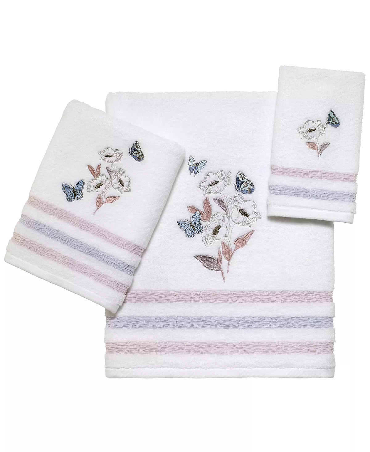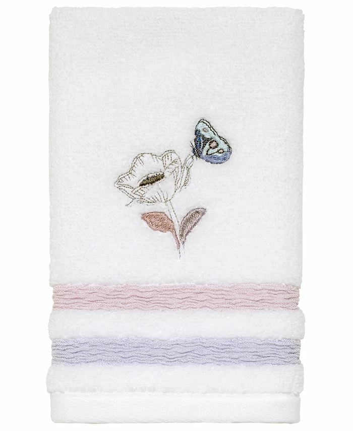 The Avanti in the Garden Fingertip Towel features an embroidered garden scene with a colorful butterfly and flower in shades of blue, white and purple on a white terry base. Stripes of blue and purple are woven into the towel to finish the look.