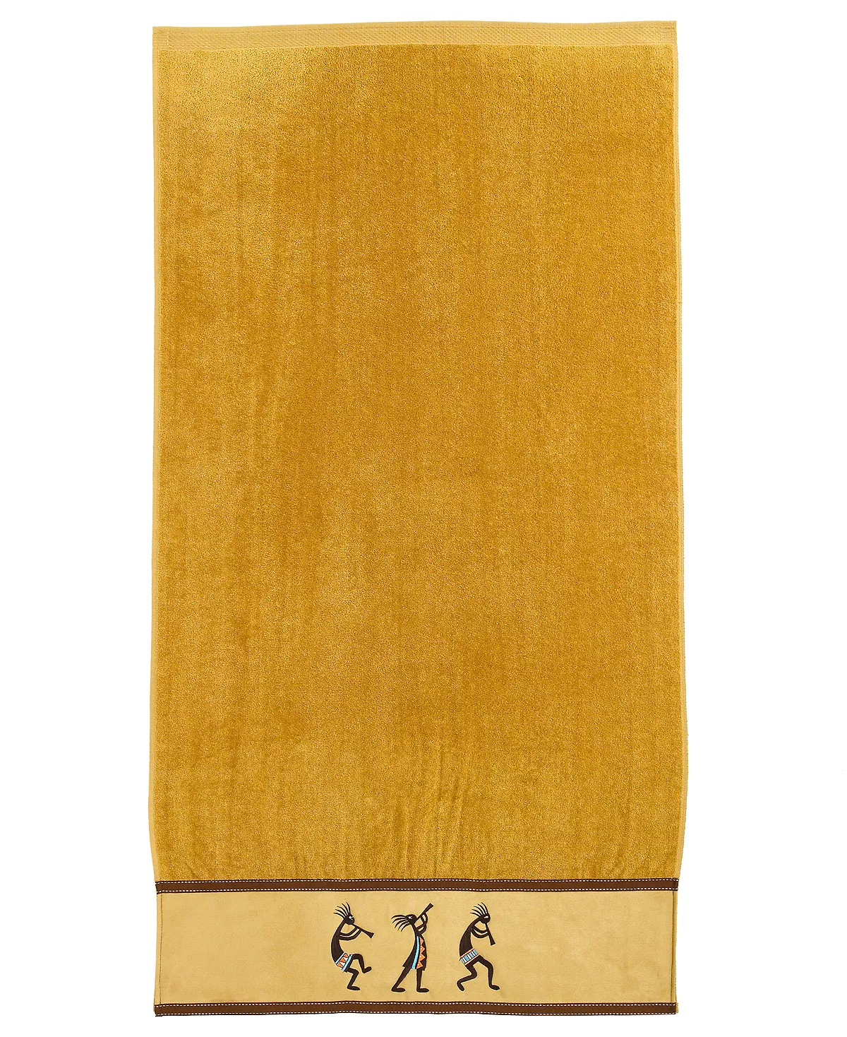Embodying the spirit of music, the Native American deity Kokopelli dances his way across this charming bath towel. Woven from sheared cotton velour with a polyester band. Stitched canvas tape border.