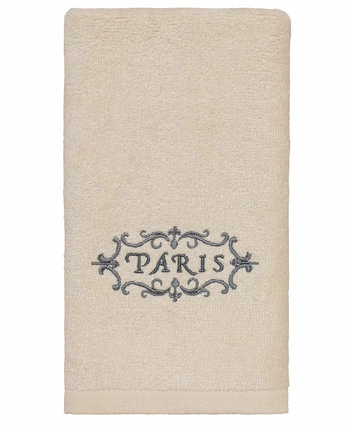 The Avanti Paris Botanique Fingertip Towel features an embroidery of “Paris” in grey surrounded by scrollwork on a 100% cotton ivory velour towel.