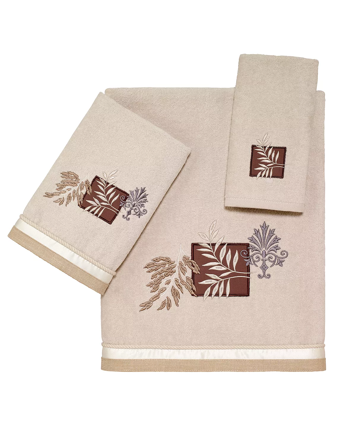 The Avanti Serenity Bath Towel features an embroidered motif of leaves and a crest in green, blue and brick red on an ivory 100% cotton velour towel. The towel is finished with a coordinating fabric border.
