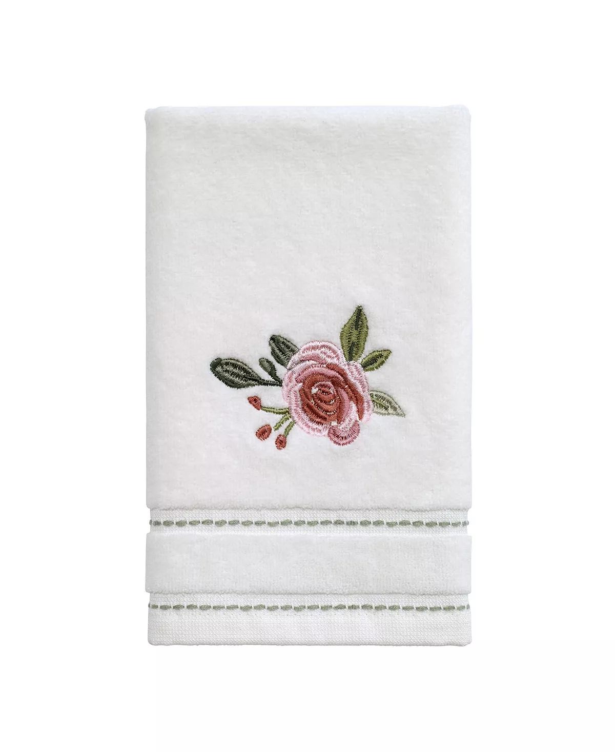 The Avanti spring garden fingertip towel is decorated with an embroidered peony in shades of pink with green leaves and woven, yarn-dyed green border stripes on an ivory ground. Made of soft and absorbent fabric ring spun. Coordinates pieces also available.