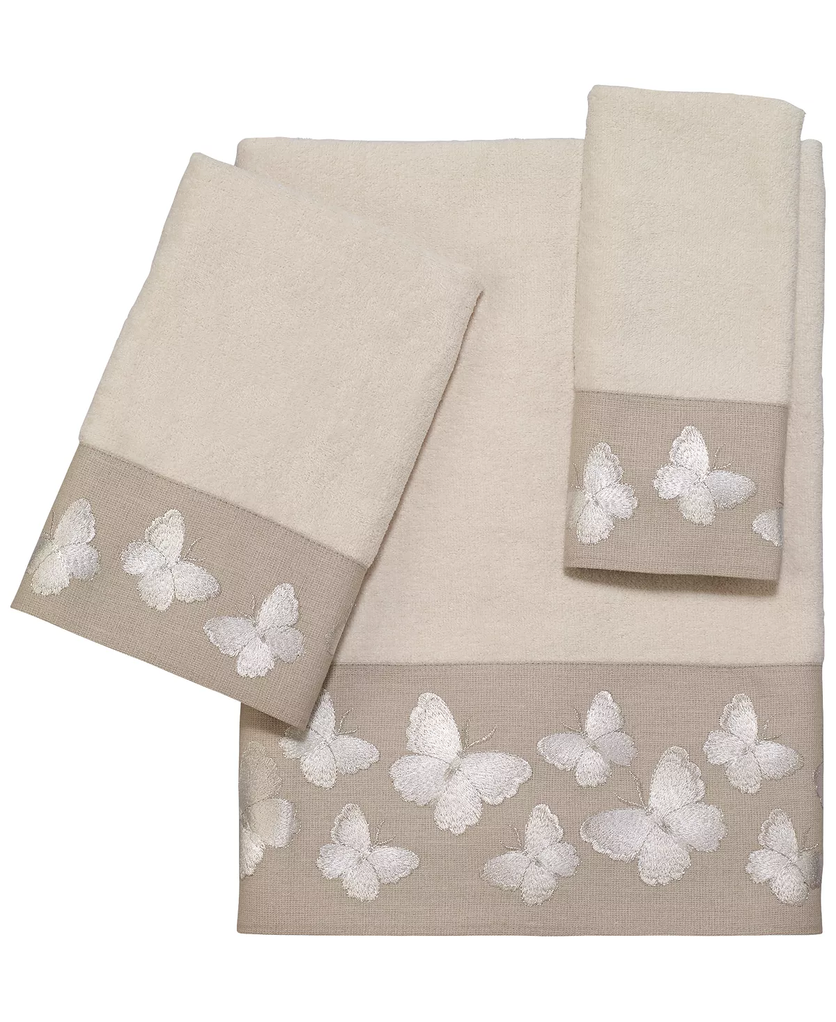 The Avanti Yara Bath Towel features a series of delicately embroidered white butterflies on the border attached to a 100% cotton velour towel.