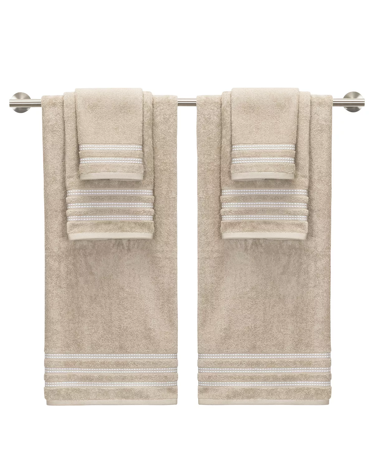 These towels bring fashion and function to any bath. Constructed of unique ring spun low twist yarns that create a quick dry towel and give an extreme soft feel. It is accented by contrasting white weft border. Certified STD-100 by OEKO-TEX.