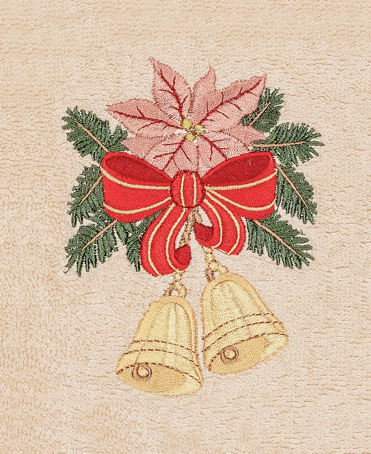 Bring a joyous Christmas spirit to your decorations with this elegant embroidered hand towels for your guest bath. These “Christmas Bells “towels feature a bouquet of golden bells, pine branches, & poinsettia graced by a red bow which will add a merry mood to your festivities! This special & luxurious Christmas towel is manufactured with more cotton per square inch for maximum softness and absorbency. Our products are produced in Linum’s state-of-the-art vertically integrated green factory in Turkey, which runs on 100% solar energy.