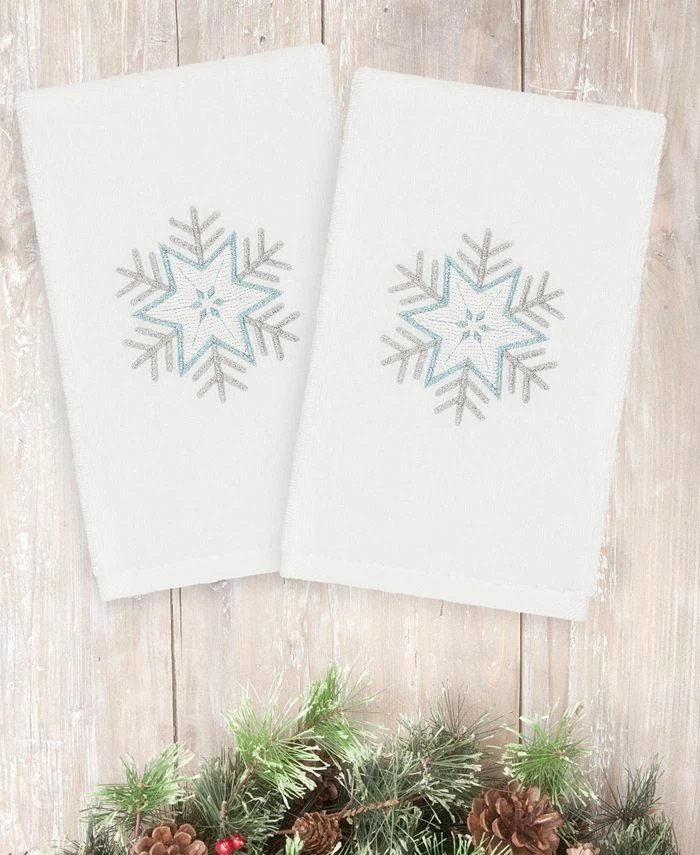 Bring a joyous Christmas spirit to your decorations with elegant embroidered hand towels for your guest bath. These “Christmas Crystal” towels feature a sparkling applique snowflake with metallic aqua and silver accents, which will add a glamorous mood to your festivities. This special and luxurious Christmas towel is manufactured with more cotton per square inch for maximum softness and absorbency. Our products are produced in Linum’s state-of-the-art vertically integrated green factory in Turkey, which runs on 100% solar energy. Set includes 2 standard size embroidered hand towels 16″ x 30″