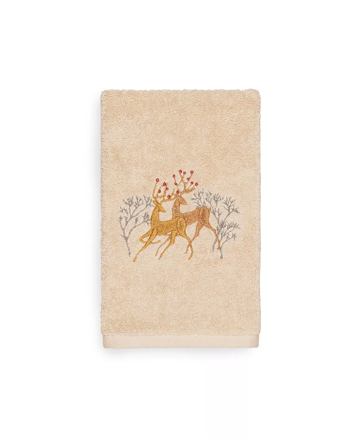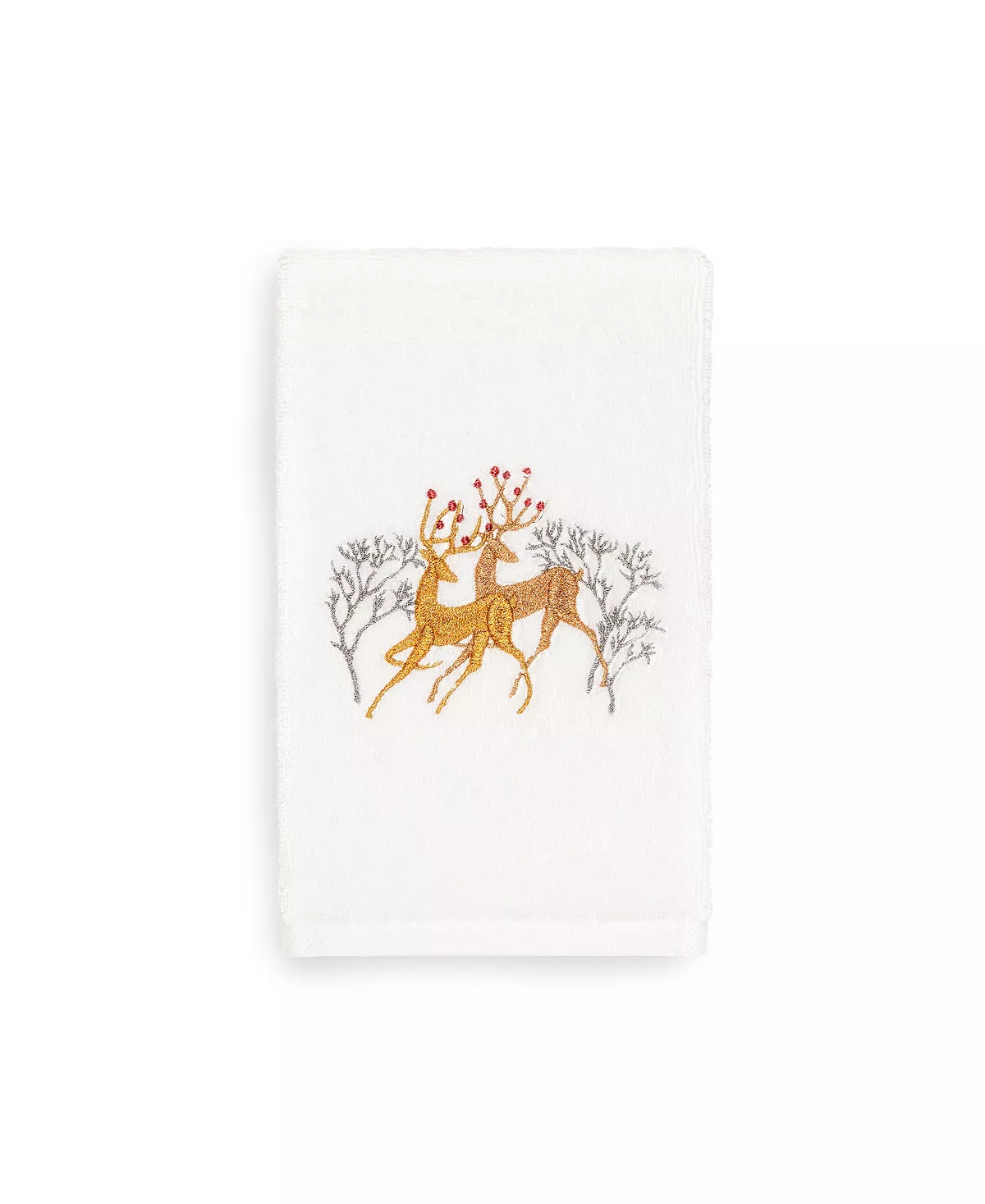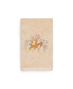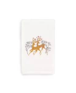 Bring a joyous Christmas spirit to your decorations with elegant embroidered hand towels for your guest bath. These “Christmas Deer Pair” towels feature prancing deer with antlers graced by red metallic ornaments, surrounded by sparkling shrubs, which will add a merry mood to your festivities! This special & luxurious Christmas towel is manufactured with more cotton per square inch for maximum softness and absorbency. Our products are produced in Linum’s state-of-the-art vertically integrated green factory in Turkey, which runs on 100% solar energy.
