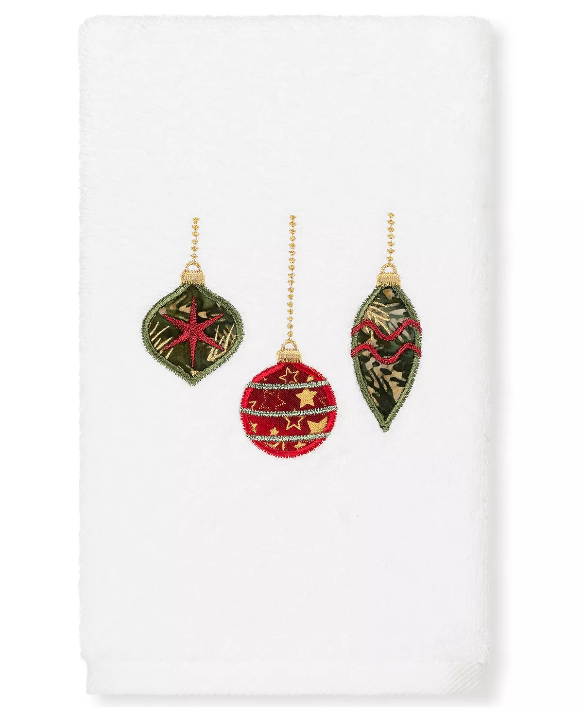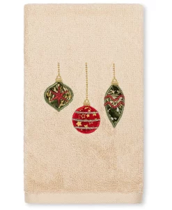 Bring a joyous Christmas spirit to your decorations with elegant embroidered hand towels for your guest bath. These “Christmas Ornaments” towels feature 3 different patterned decorations, suspended by sparkling beaded chains, which will add a merry mood to your festivities.