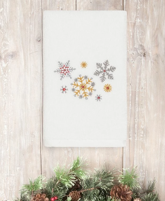 Bring a joyous Christmas spirit to your decorations with elegant embroidered hand towels for your guest bath. These “Christmas Snowfall” towels feature bouncing snowflakes of silvery, golden & ruby tones which will add a merry mood to your festivities! This special & luxurious Christmas towel is manufactured with more cotton per square inch for maximum softness and absorbency. Our products are produced in Linum’s state-of-the-art vertically integrated green factory in Turkey, which runs on 100% solar energy.