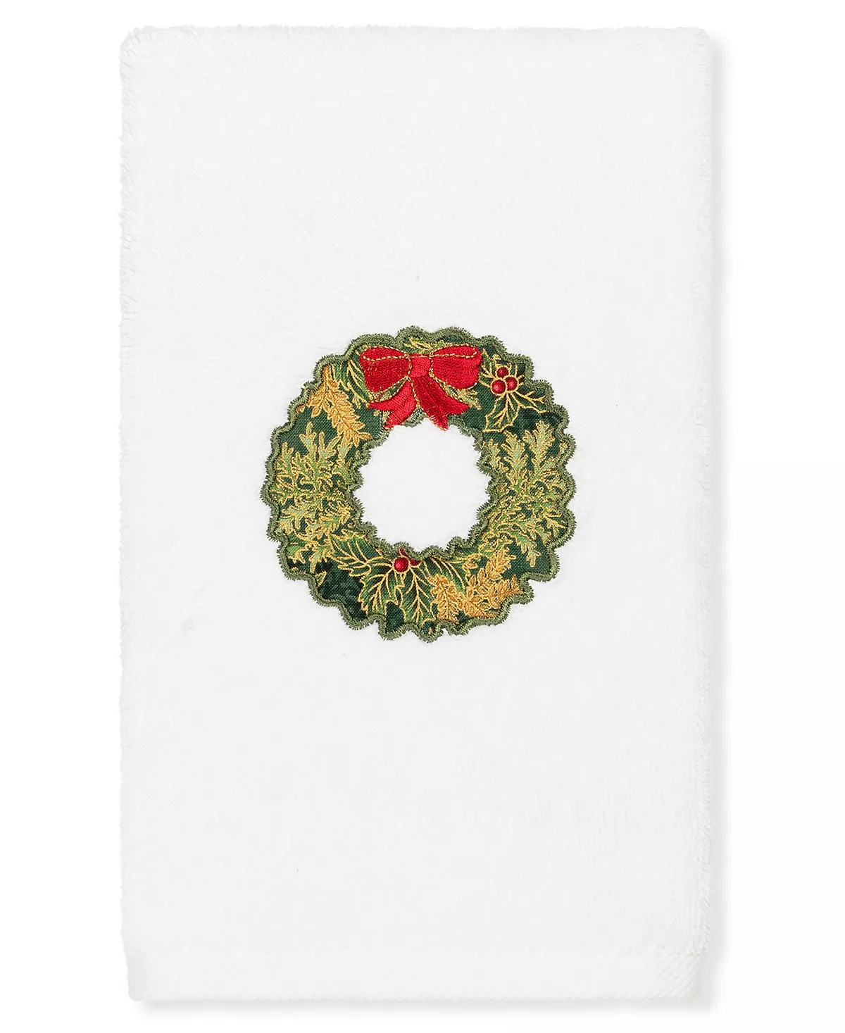 Bring a joyous Christmas spirit to your decorations with elegant embroidered hand towels for your guest bath. These “Christmas Wreath” towels feature a metallic patterned wreath decorated with a lustrous red bow, which will add a merry mood to your festivities.