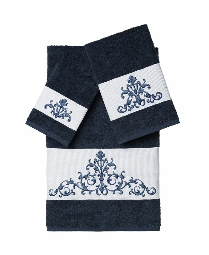 The SCARLET Embellished Towel Collection features an elegant scrolling crest motif on a textured woven border. These soft and luxurious towels offer lasting absorbency and superior durability. 3PC Embellished Set includes 1 Bath Towel,1 Hand Towel, 1 Washcloth.