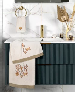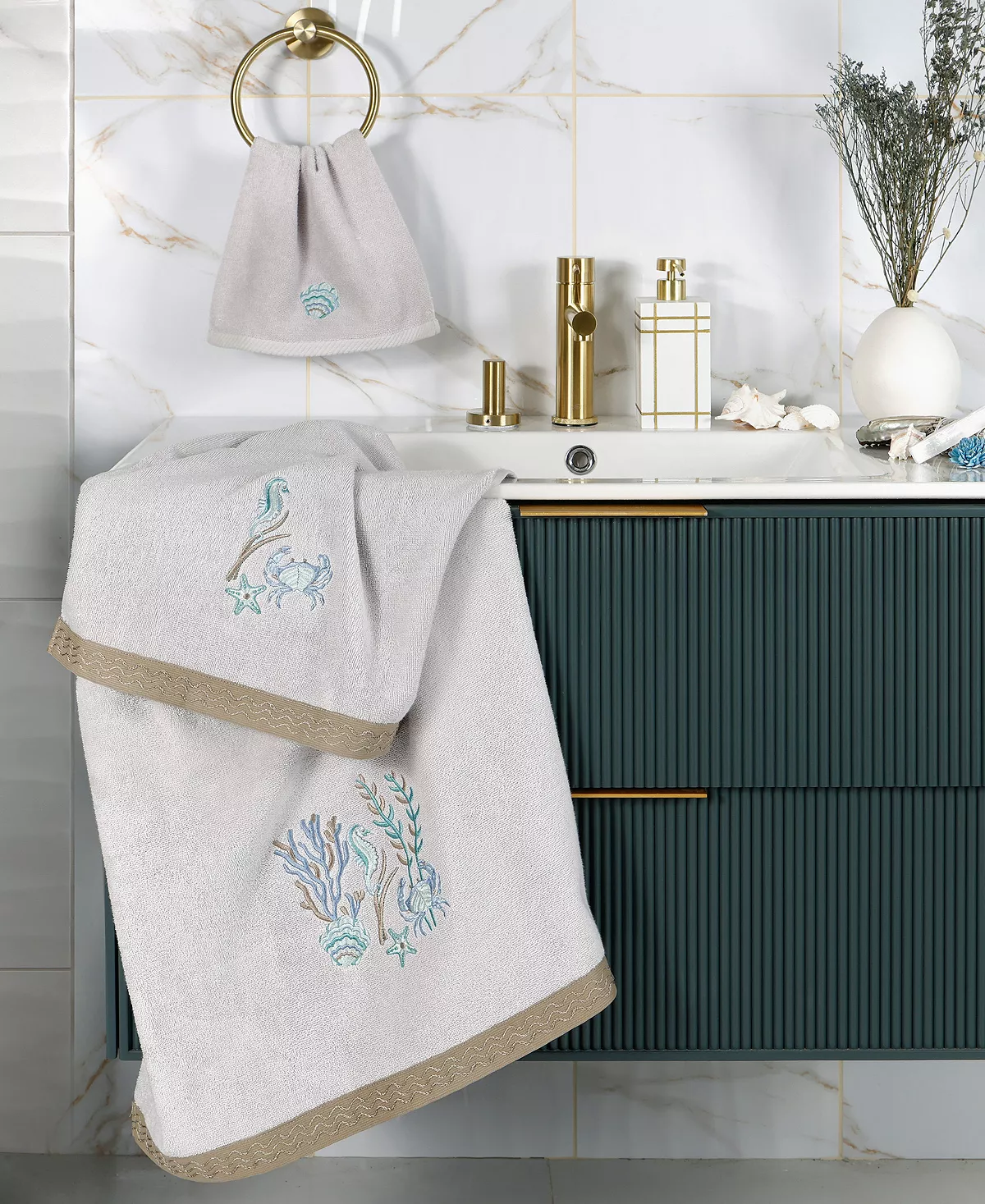 The AARON towels feature colorful sea life and are trimmed with an embroidered canvas border. Cloud soft and absorbent, these luxurious, durable towels keep their plush appearance after washing. The AARON towel collection brings coastal spirit and richness to your home decor and makes a great gift.