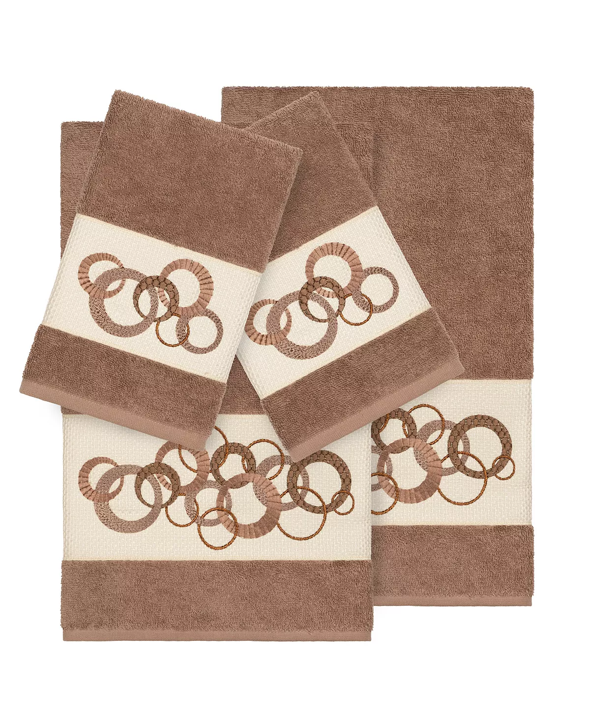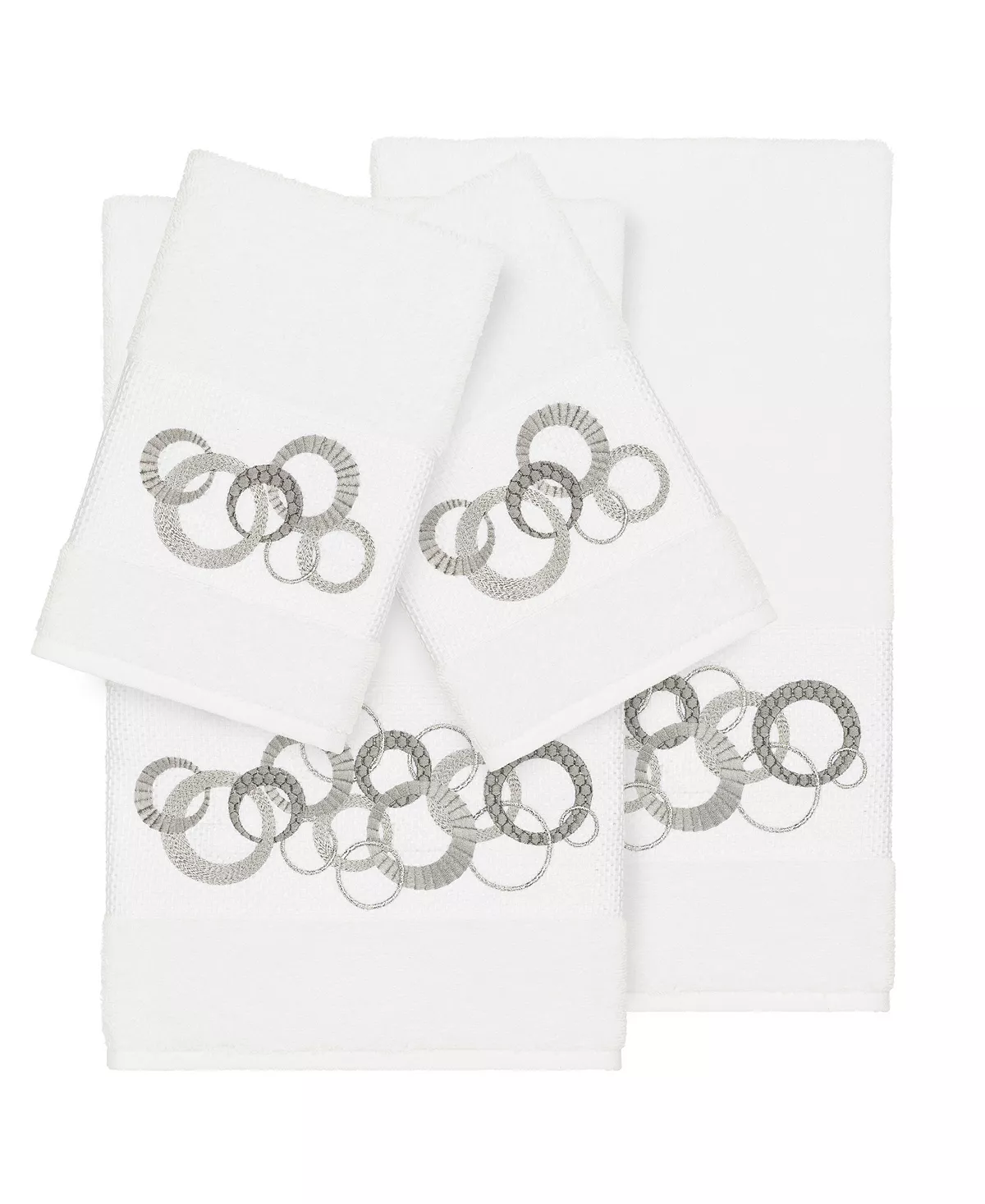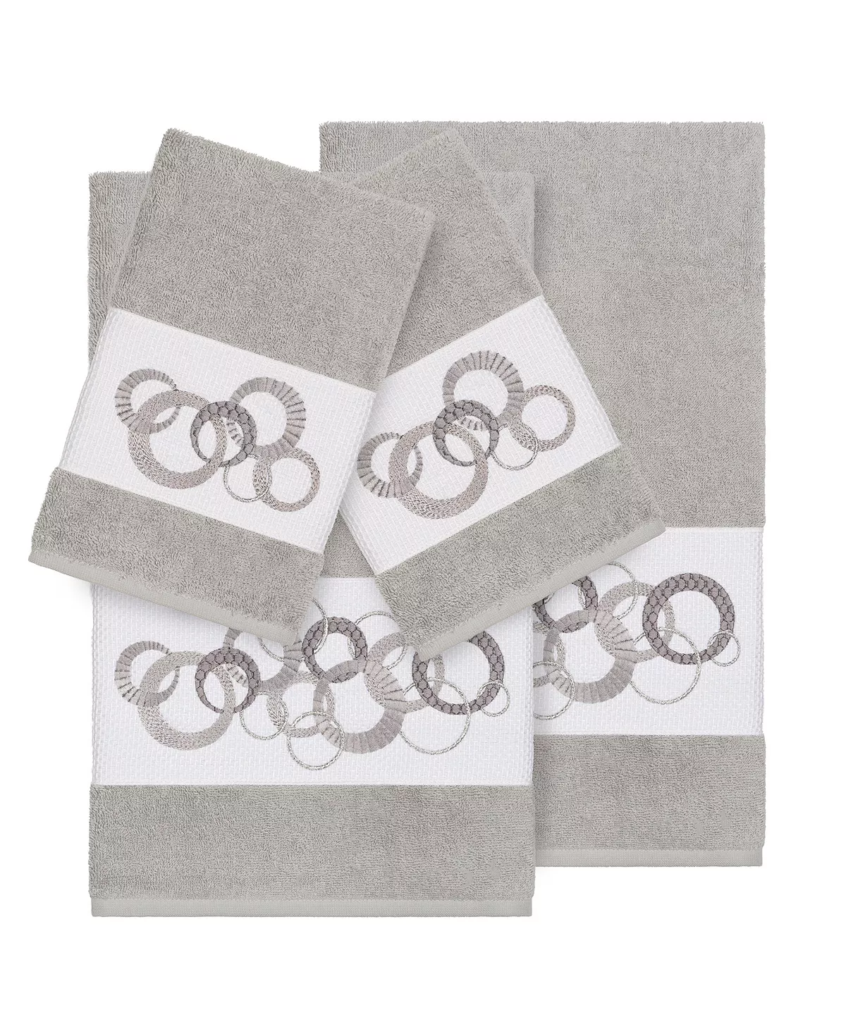 The Annabelle Embellished Towel Collection features a whimsical circle motif with metallic accents on a textured woven border. These soft and luxurious towels are made of premium Turkish Cotton and offer lasting absorbency and superior durability. These lavish Turkish cotton towels are produced in Linum’s state-of-the-art vertically integrated green factory in Turkey, which runs on solar energy.