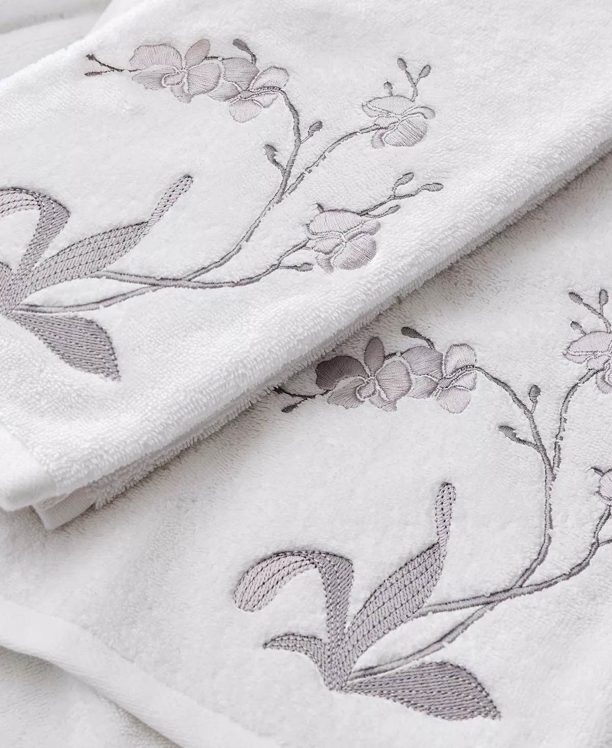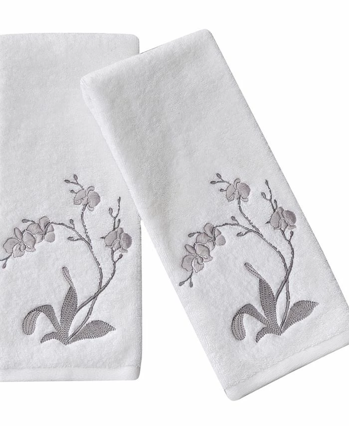 Inspired by the delicate beauty of the orchid flower this guest towel offers timeless luxury in a guest bathroom. The silver embroidered orchid flower graces the face of this white towel. Fashioned with 100% cotton to be soft to the touch.